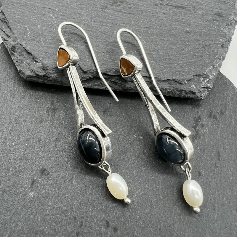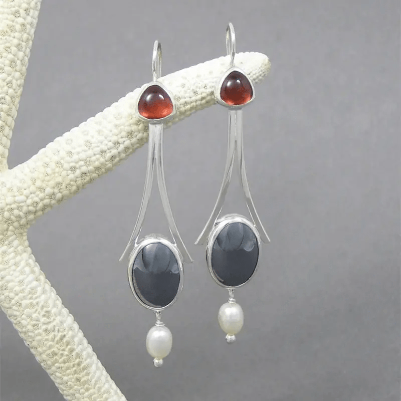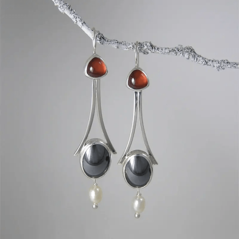 Vintage Metal Craftsman Inlaid Red Black Stone Earrings