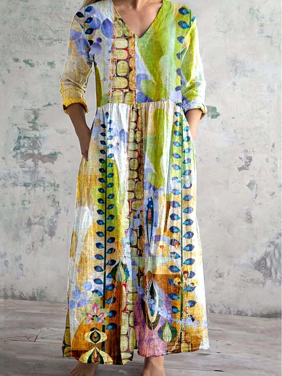 Women's Vintage Boho Stripe Pattern V Neck Dress with Pockets